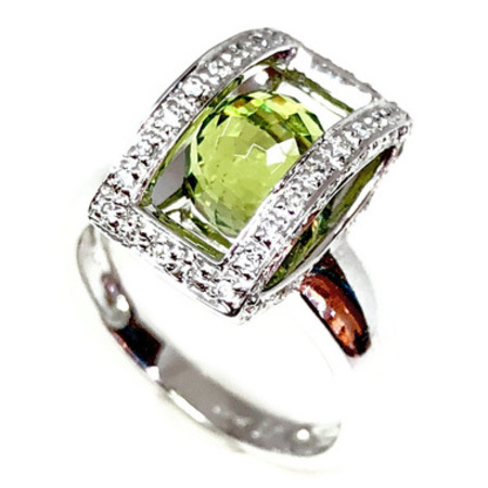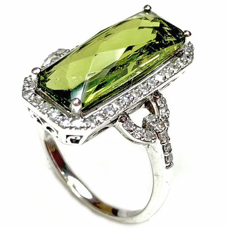 Elegant Design Diamond Ring 14K White Gold , 4.50GR. Ring Size is 6.75 , Width in The Middle is 20MM & Sides is 1.5MM , 62 Diamonds 0.38CT & Green Center Stone Is 1PT 3.70CT , Diamonds Clarity SI1 &It is H Color.
