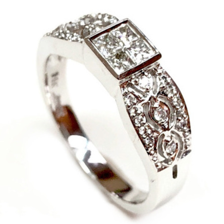 Elegant Design Diamond Ring 14K White Gold, 3.95GR. Ring Size is 6.75 , Width is 5.5MM , 26 Diamonds 0.10CT. 4PR 0.25CT , Diamonds Clarity SI1 &It is H Color.